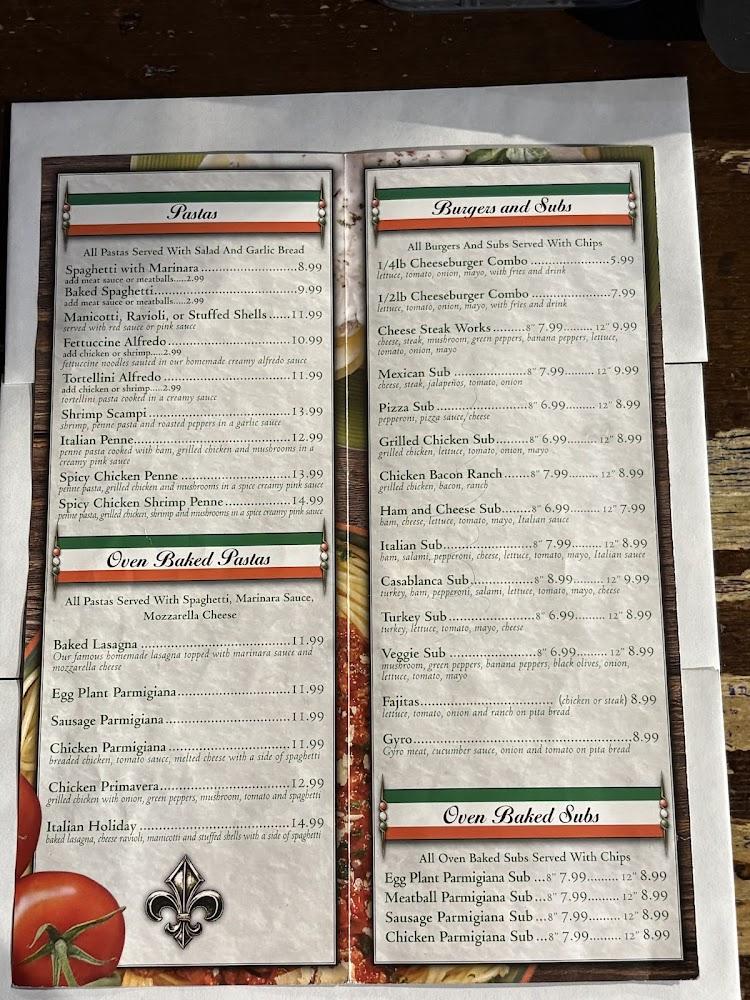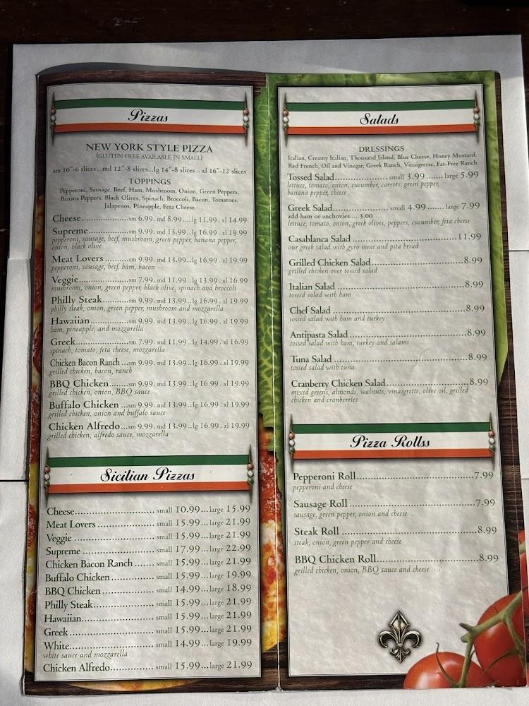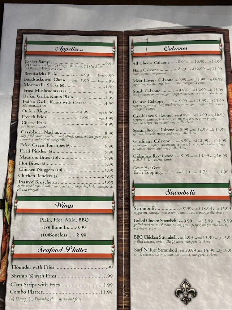 Casablanca's menu features a delightful array of Italian dishes, catering to diverse tastes. Highlights include their signature pizzas and calzones, which come in various flavors like meat lovers and veggie options. Pasta lovers can find comforting dishes such as fettuccine Alfredo and baked lasagna, each served with salad and bread.